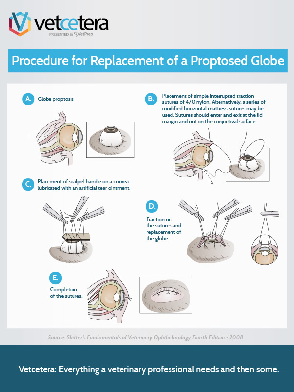 This infographic reviews the steps for replacing a proptosed globe in dogs and cats.